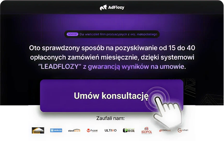 Podczas tego spotkania dowiesz się, jak wykorzystamy metodę LeadFlozy, aby dostarczać Ci od 15 do 40 opłaconych zamówień miesięcznie. Wyjdziesz z tej rozmowy z gotowym planem przejęcia przez nas tych obowiązków, żebyś Ty mógł w 100% skupić się na produkcji.