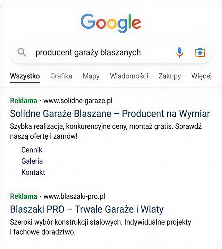 Pokażemy Ci konkretne wyniki prosto z kont reklamowych innych producentów bram i wiat, zamiast teoretyzować i uczyć się specyfiki Twoich produktów na Twoim budżecie.