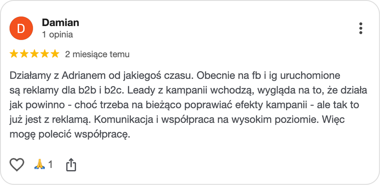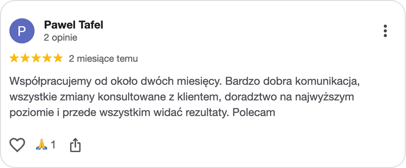 Podpisujemy jasną umowę i od tego momentu my stajemy się Twoim zewnętrznym działem marketingu. Przejmujemy obsługę Twojej strony, Google oraz Facebooka. Ty zyskujesz jednego partnera, który bierze pełną odpowiedzialność za wyniki. Koniec z byciem pośrednikiem i tłumaczeniem agencjom, na czym polega Twój biznes.