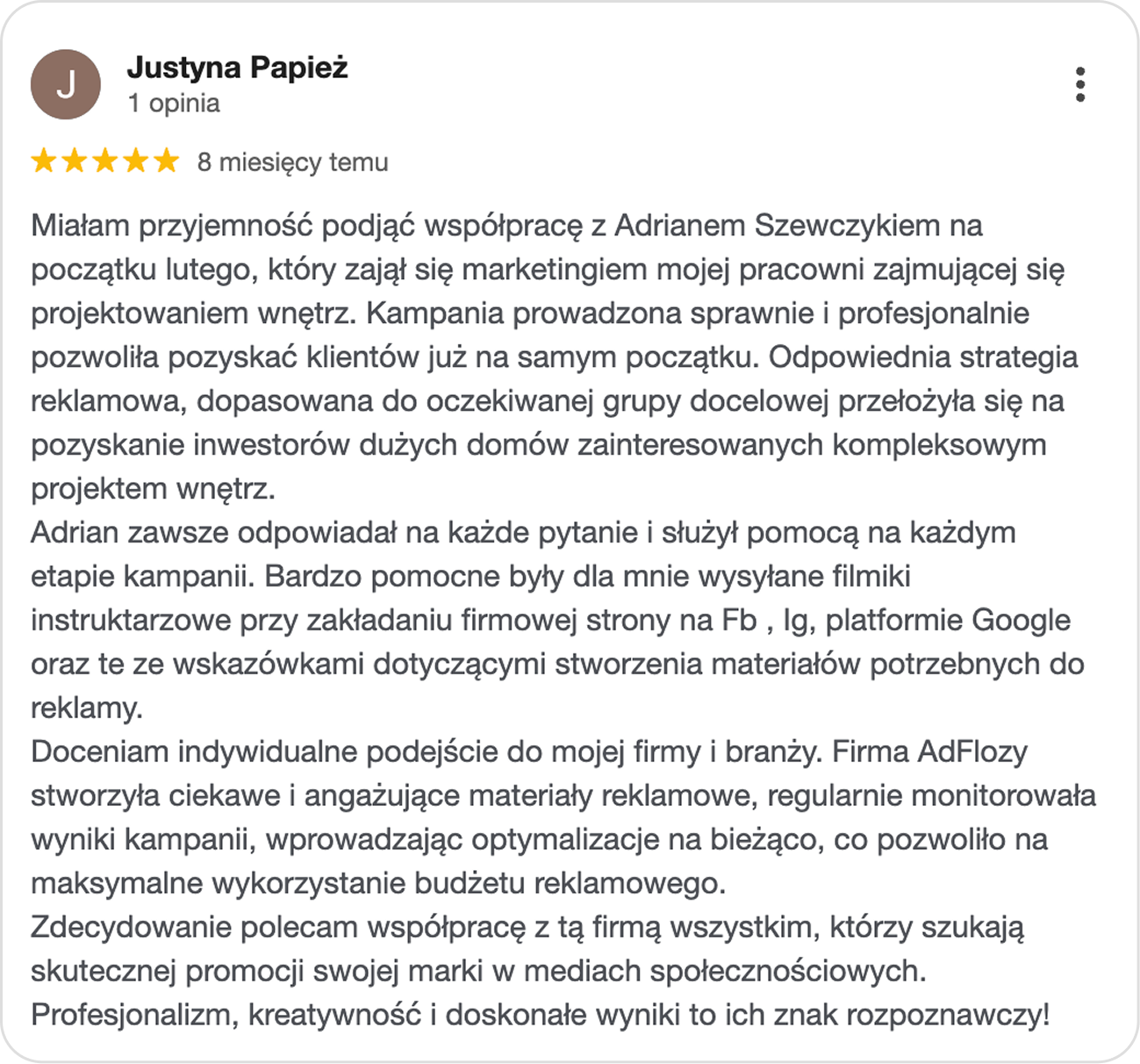 Zrobiliśmy pełne „opakowanie” marki: od nowej, dobrze konwertującej strony ze sklepem, po dopracowane social media i stałe kampanie Meta + Google. Efekt to uporządkowana komunikacja, lepsze zaufanie i realne zamówienia z działań online.